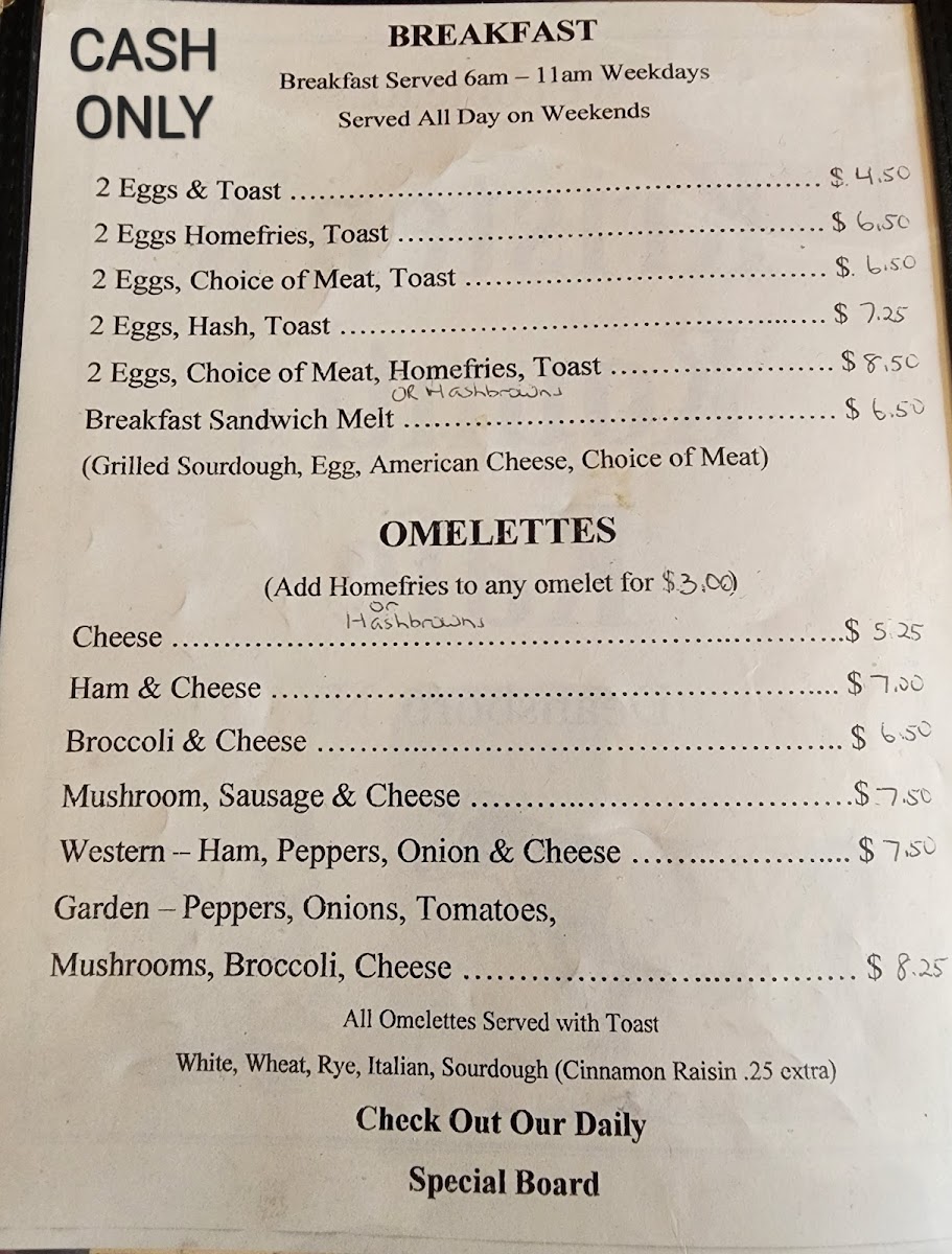 Side options are varied and include classic comfort foods such as Hash, Toast, Homefries, and even a Bowl of Oatmeal for a warm, hearty option. For a twist on your toast, you can opt for Cinnamon Raisin Toast, which adds a hint of sweetness to your breakfast. The sides are the perfect complement to any of the main breakfast dishes, adding variety to your meal.